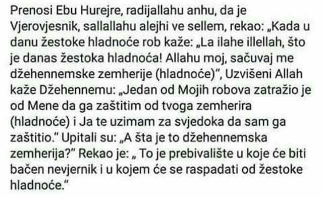 Prenosi Ebu Hurejre, radijallahu anhu, da je Vjerovjesnik, sallallahu alejhi ve sellem, rekao: “Kada u danu žestoke hladnoće rob kaže: “La ilahe illellah, što je danas žestoka hladnoća! Allahu moj, sačuvaj me džehennemske zemherije (hladnoće)”, Uzvišeni Allah kaže Džehennemu: “Jedan od Mojih robova zatražio je od Mene da ga zaštitim od tvog zemherira (hladnoće) i Ja te uzimam za svjedoka da sam ga zaštitio.” Upitali su: “A šta je to džehennemska zemherija?” Rekao je: “To je prebivalište u koje će biti bačen nevjernik i u kojem će se raspadati od žestoke hadnoće.”