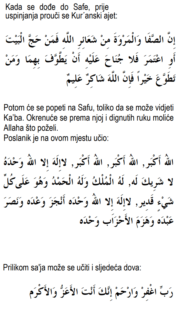 Ide se na obližnje brdašce Safu kako bi se obavio sa’j. Kada se dođe do Safe, prije uspinjanja prouči se Kur´anski ajet: