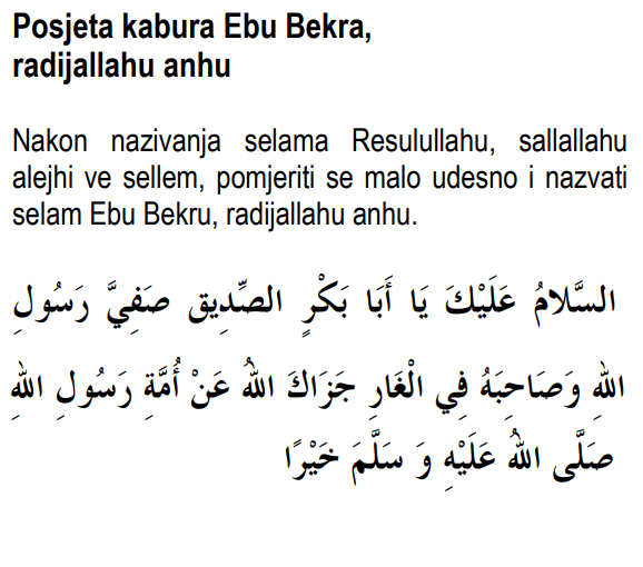 „ES-SELAMU ALEJKE JA EBA BEKRINI-SSIDDIK, SAFIJJE RESULILLAH, VE SAHIBEHU FIL-GAR. DŽEZAKELLAHU AN UMMETI RESULILLAHI, SALLALLAHU ALEJHI VE SELLEME, HAJREN!”