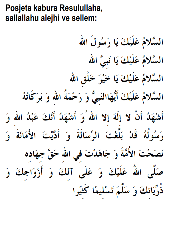 Svjedočim da nema istinskog boga osim Allaha i svjedočim da si ti Allahov rob i poslanik! Potvrđujem da si dostavio Objavu, ispunio emanet, savjetovao Ummet i istinski se borio na Allahovom putu! Neka su neizmjerni Allahov blagoslov i mir na tebe, tvoju porodicu, tvoje supruge i tvoje potomostvo.”